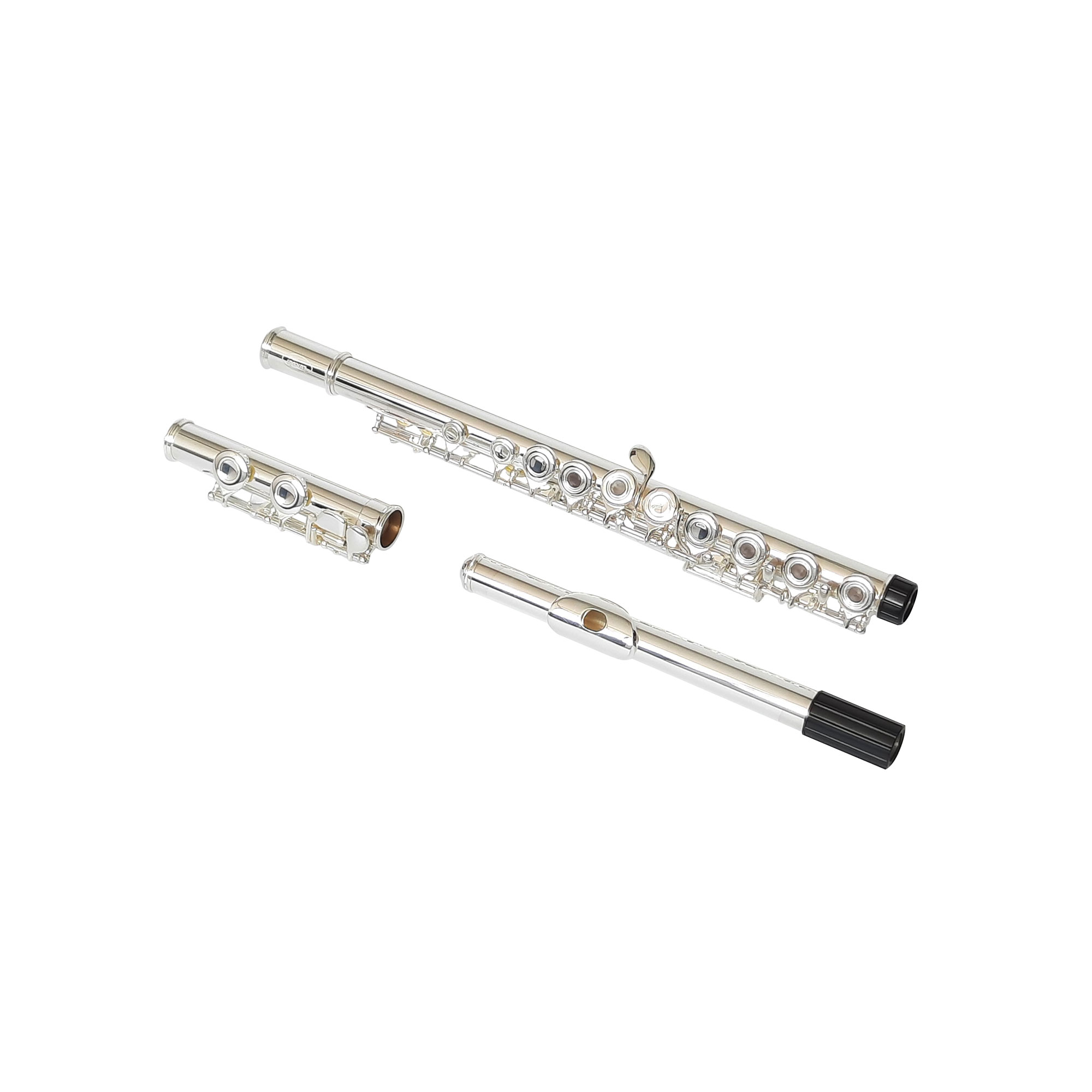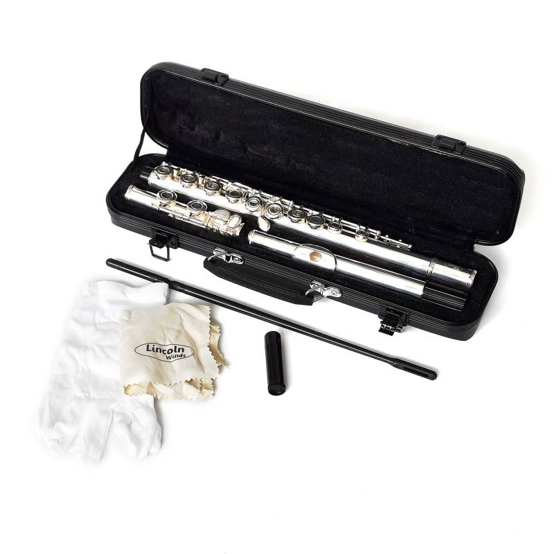 Flauta traversa C, cuerpo de aleación de cobre y níquel, llaves abiertas, sol desalineado y Mi partido. Con estuche rígido, guantes, paño de limpieza, grasa lubricante y tarjeta de confianza/garantía de 6 meses.