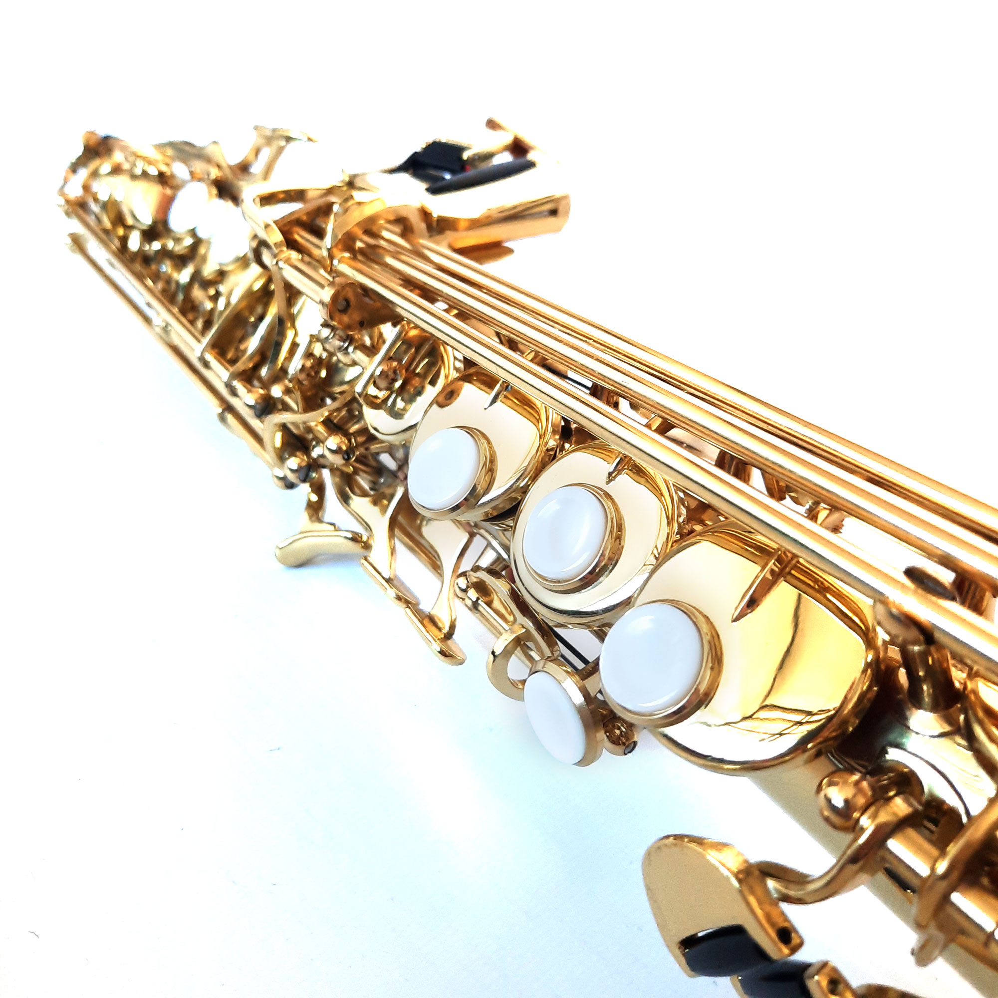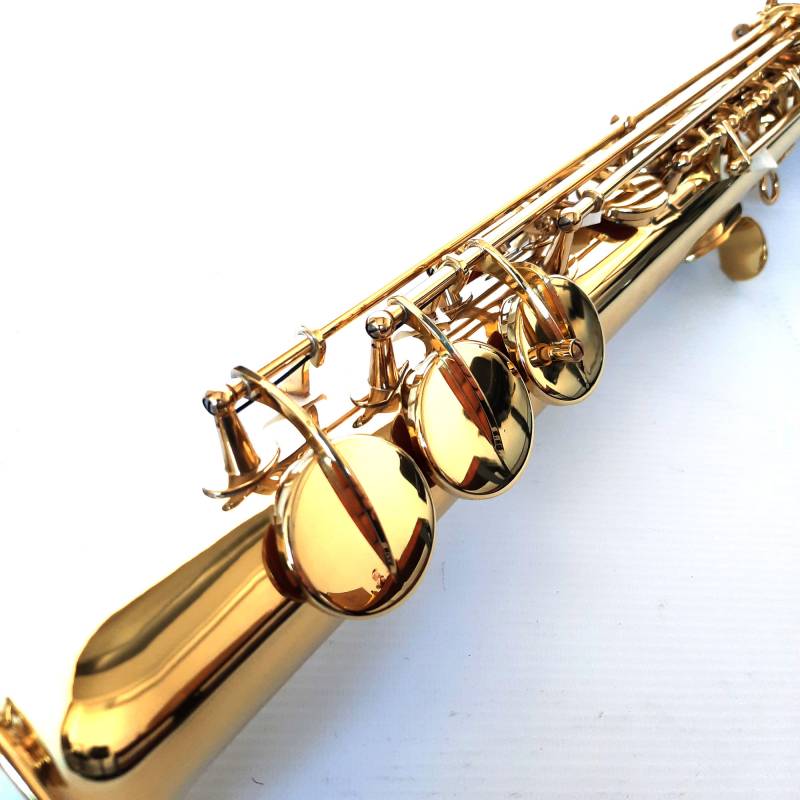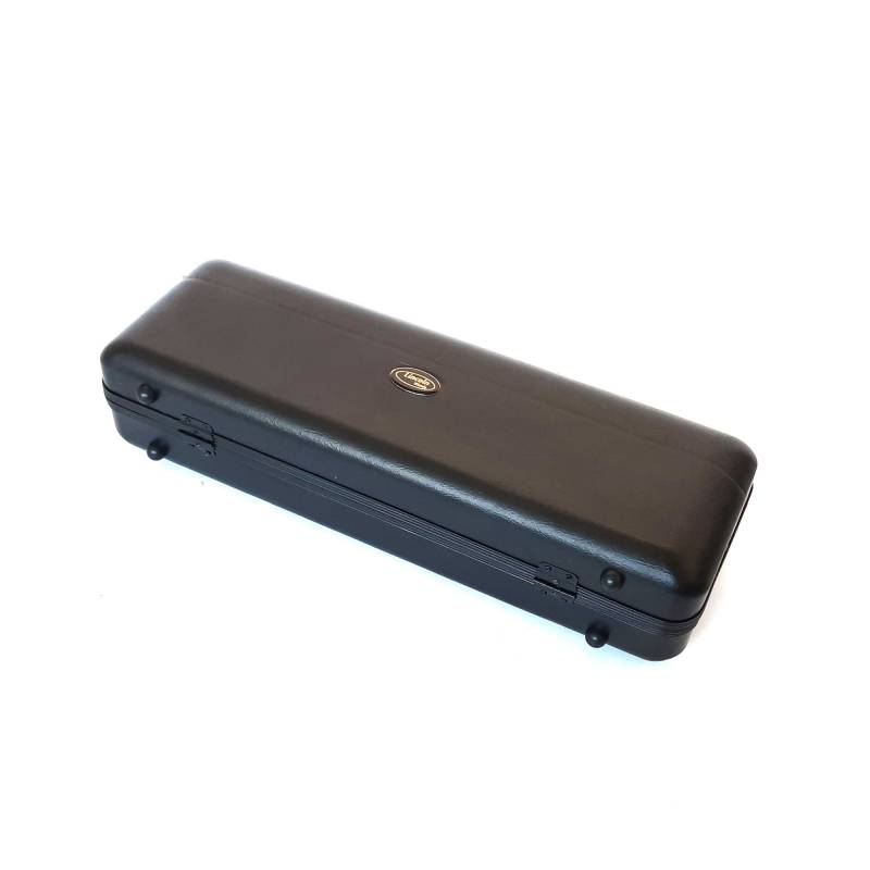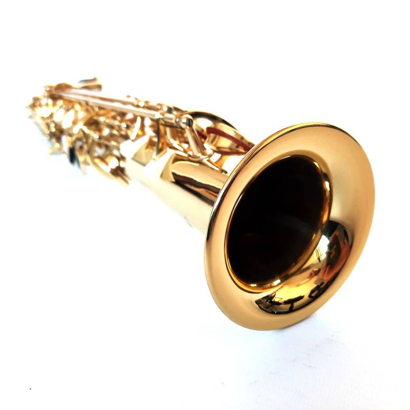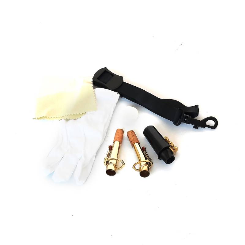 Terminación en laca dorada, con doble cuello, recto y curvo, estuche de cuero, grasa lubricante, correa y tarjeta de confianza/garantía de 6 meses.